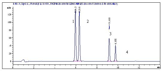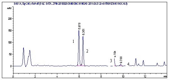 注:梯度洗脱条件,操作者可根据样品的不同选择最佳条件,使4种成分与其他组分峰获得完全分离。